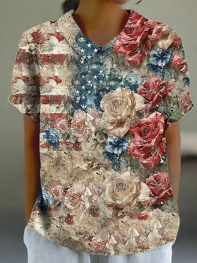 Women's Retro Floral Independence Day Print Casual Shirt