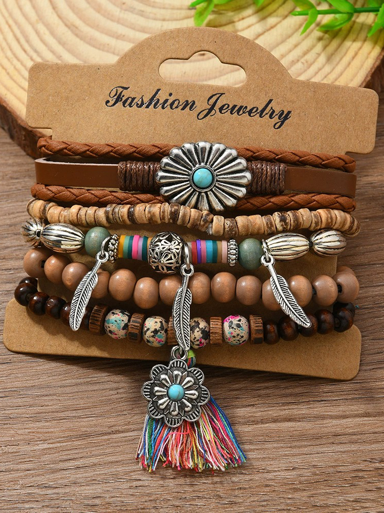 Bohemian Style Floral Tassel Leather Coconut Shell Wood Bead Bracelet 5-piece Set