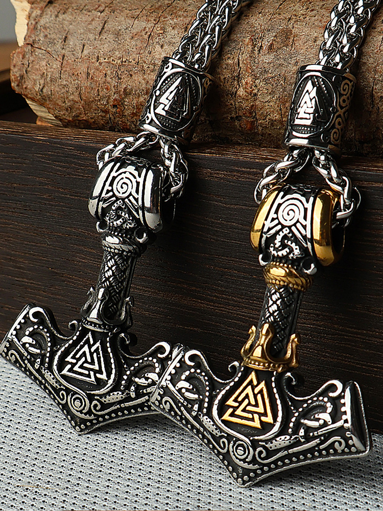 Viking Wolf Head Thor's Hammer Pendant Necklace