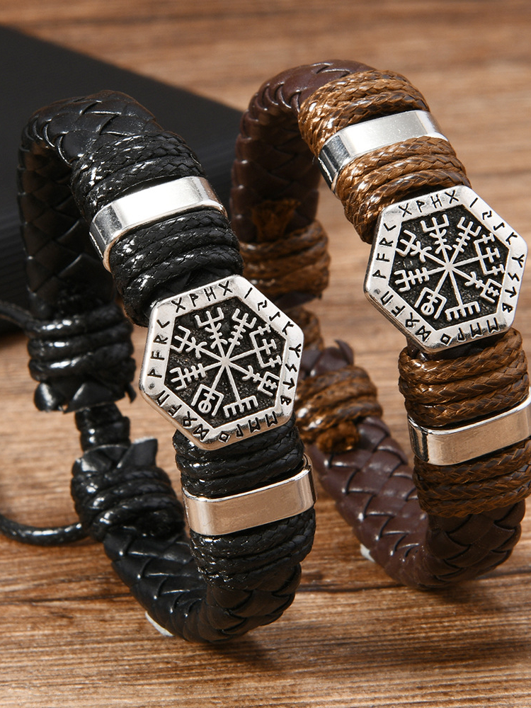 Vintage Viking Vegvisir Leather Woven Bracelet