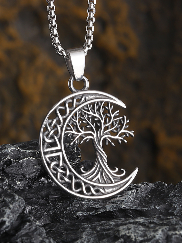 Vintage Viking Tree Of Life Celtic Moon Silver Necklace