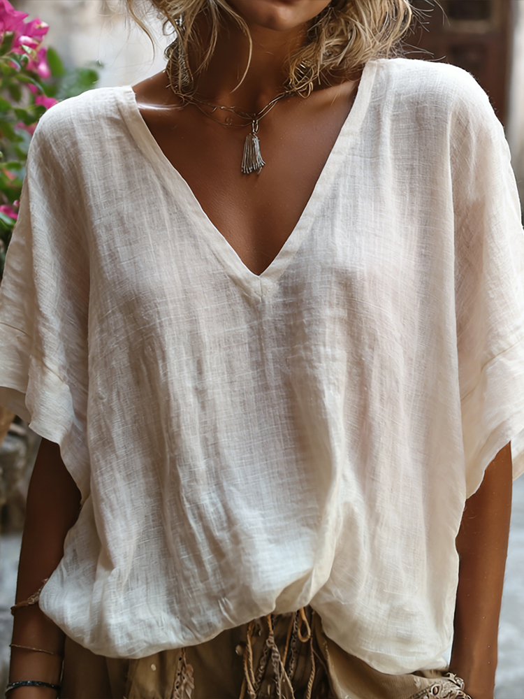Women's Vintage Casual Jacquard Short-sleeve V Neck Top