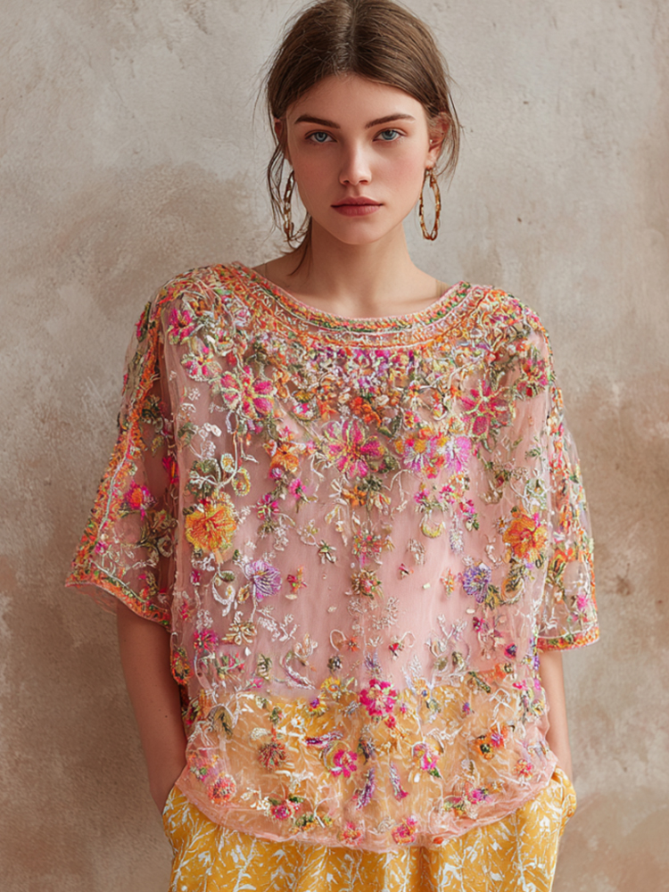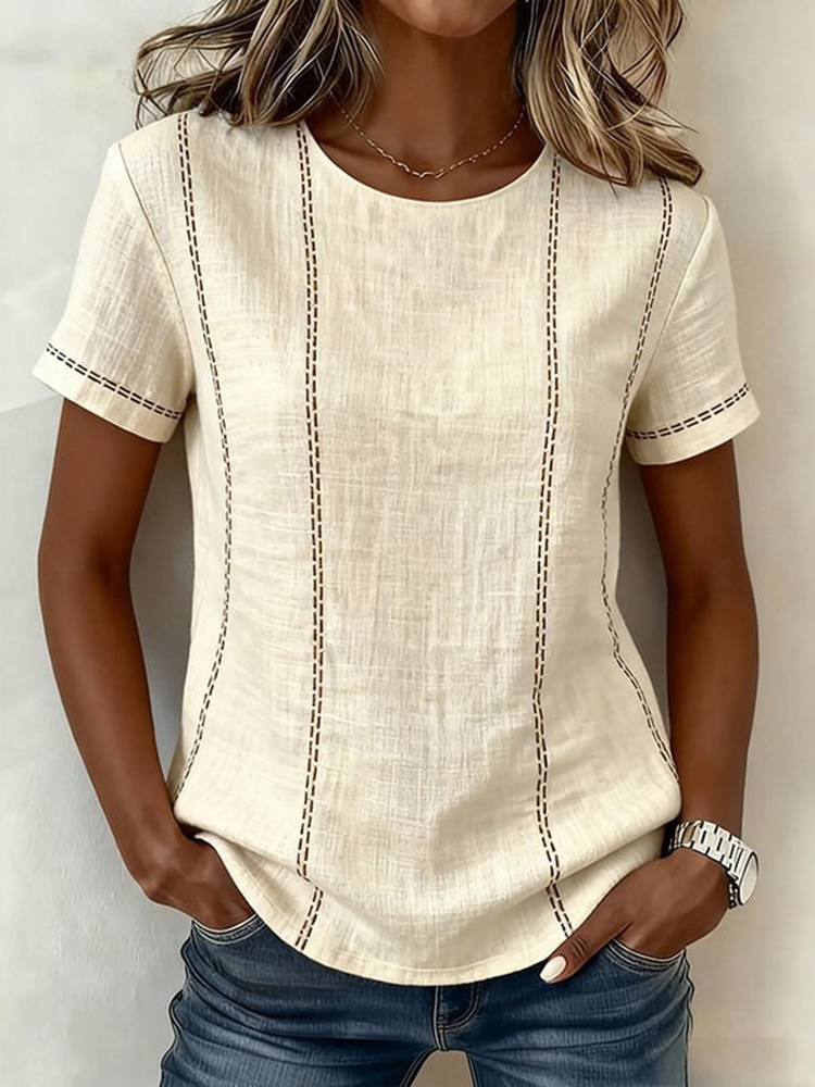 Vintage Romantic Floral Embroidery Art Round Neck Linen Blend Short Sleeve Top
