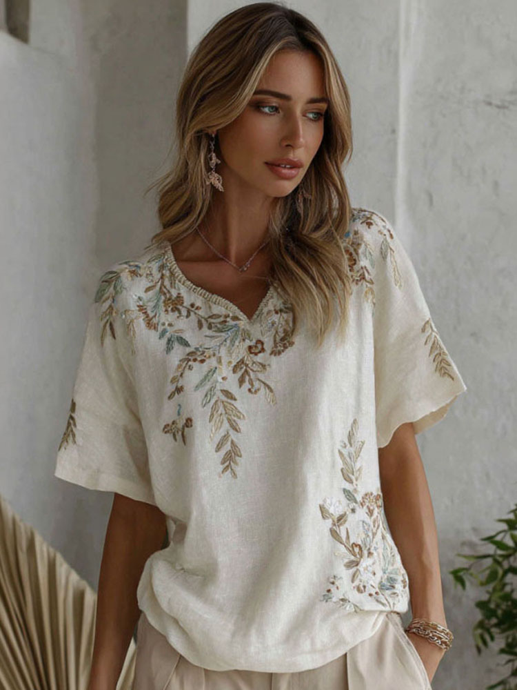 Women's Vintage Floral Embroidery Art V-neck Linen Blend Short Sleeve Top