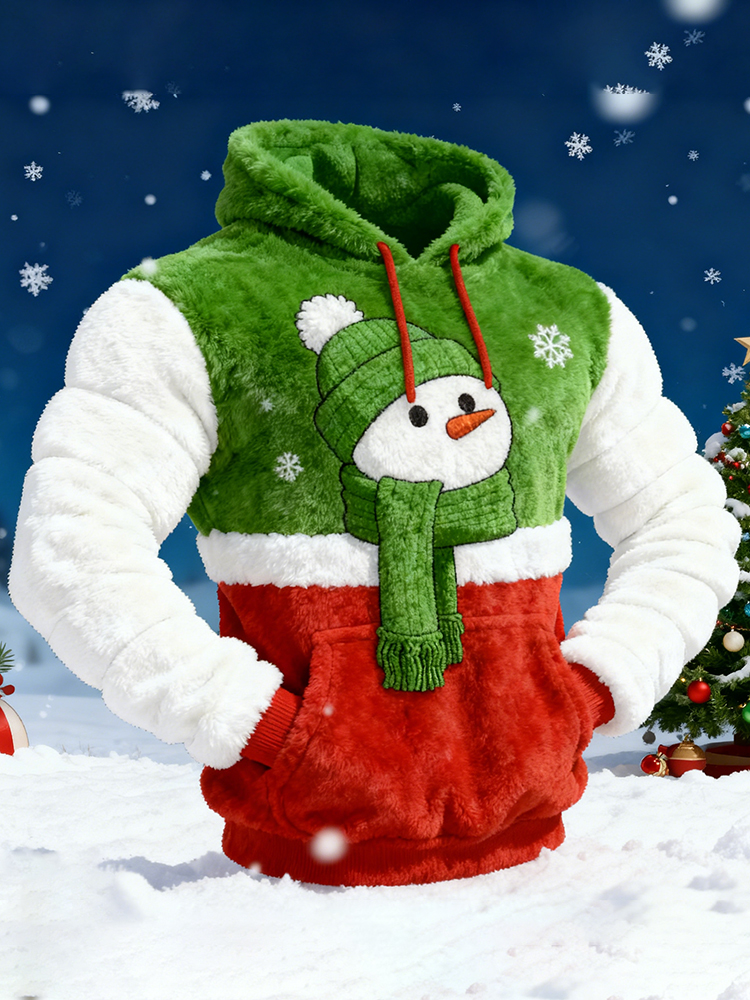 Men's Fun Christmas Snowman Color Block Plush Hoodie