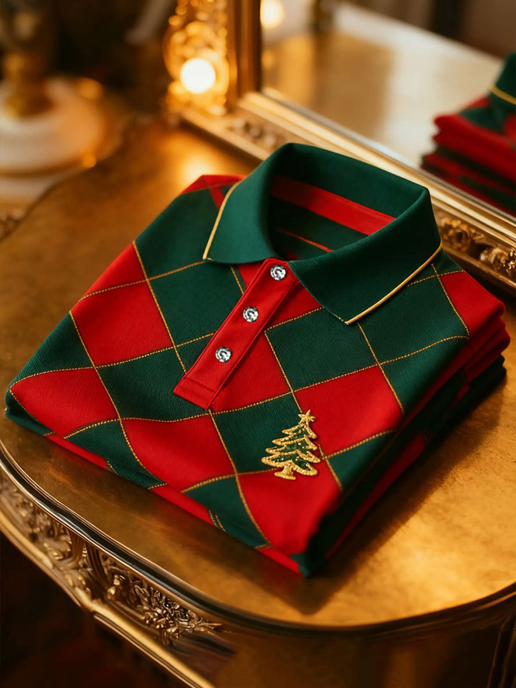 Christmas Tree Print Men's Long-sleeved Casual Polo Shirt