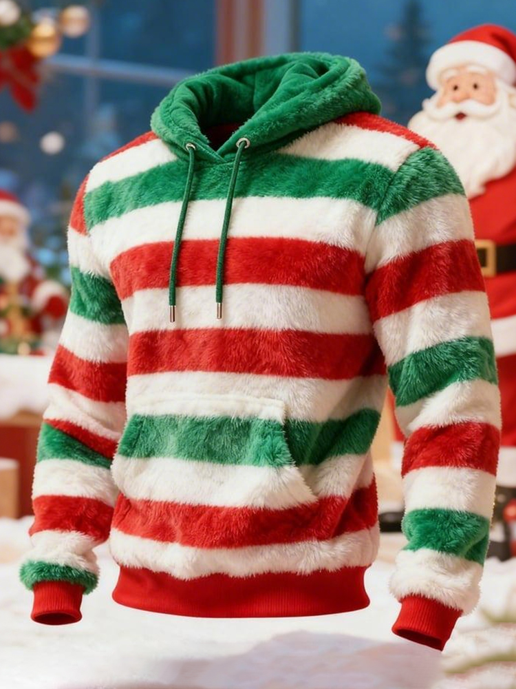 Men's Christmas Striped Print Plush Warm Hoodie