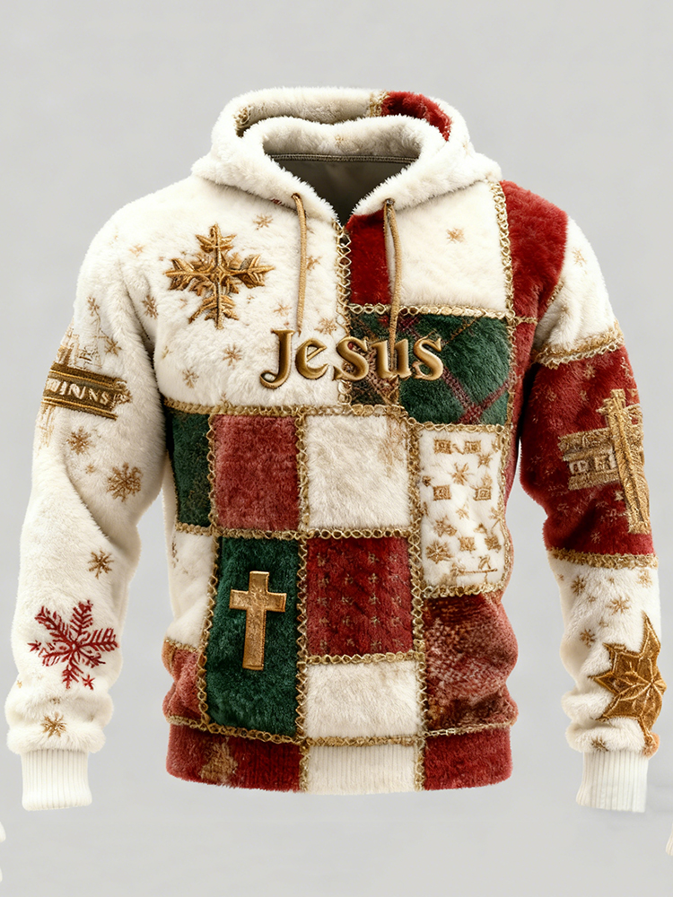 Men's Christmas Jesus Patchwork Print Plush Warm Hoodie