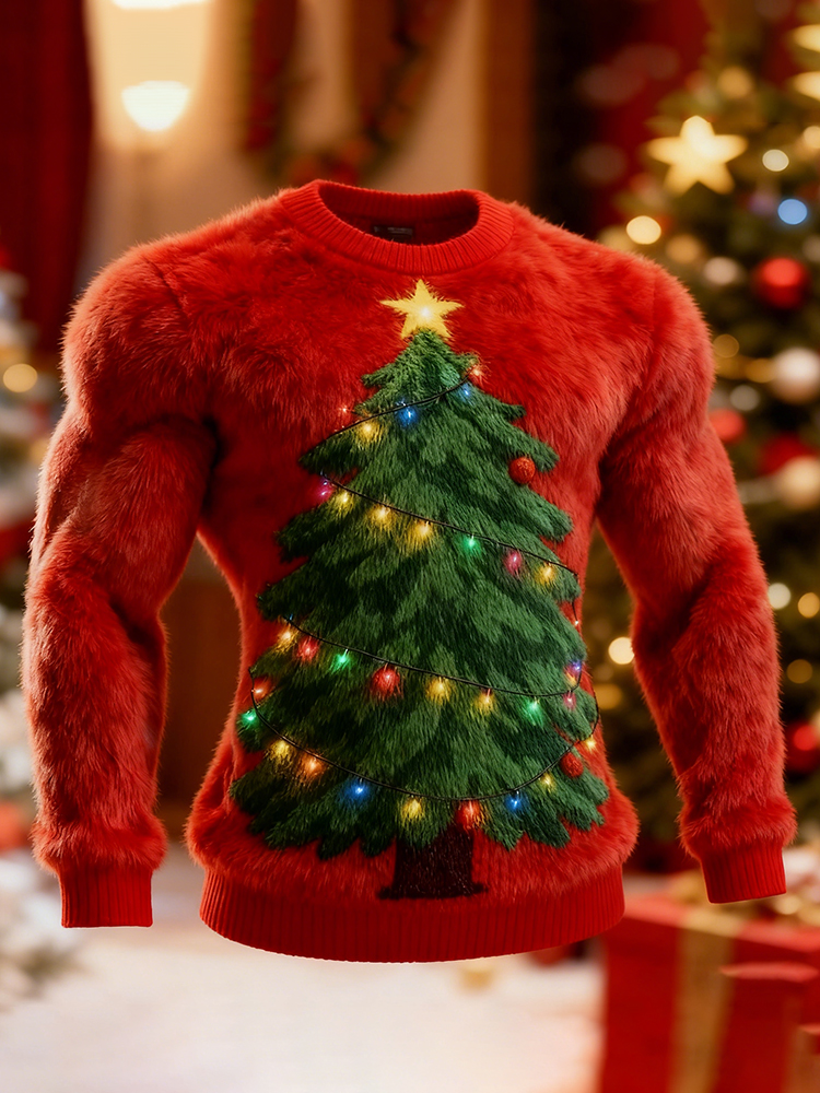 Men's Ugly Christmas Tree Art Crew Neck Plush Sweatshirt