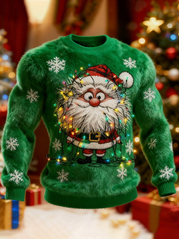 Men's Ugly Christmas Santa Claus Art Crew Neck Plush Sweatshirt