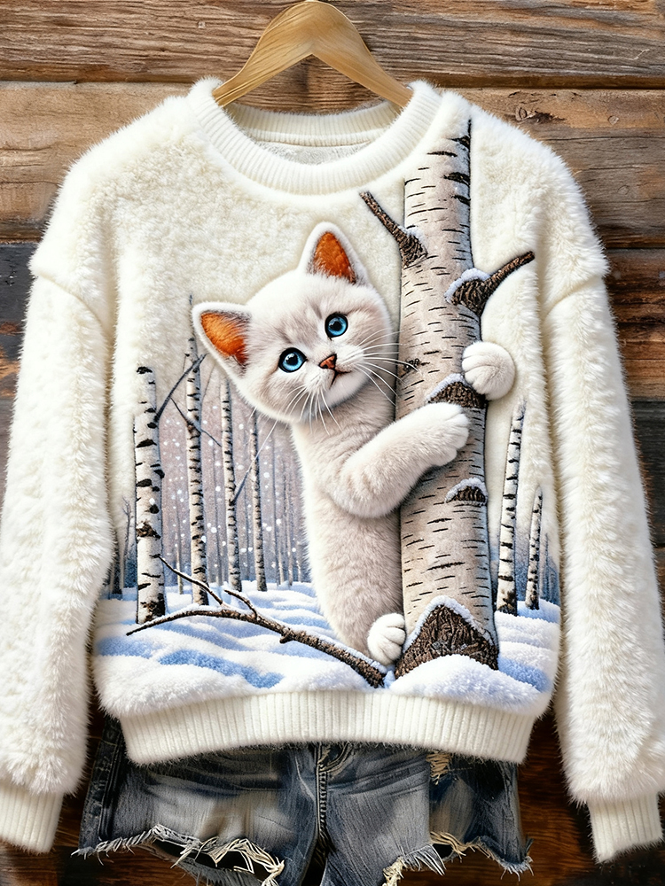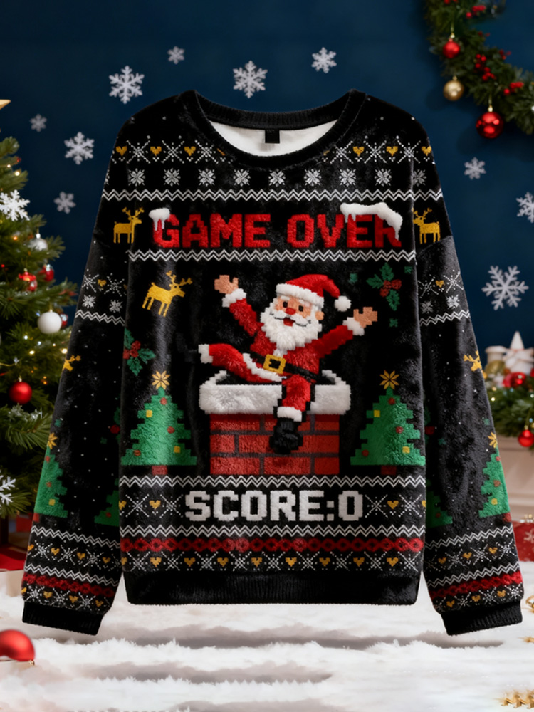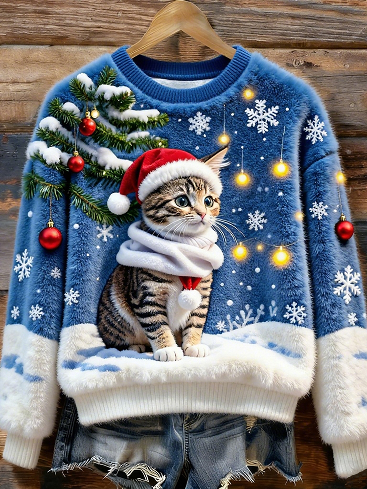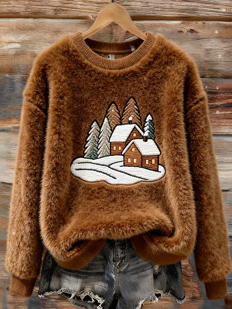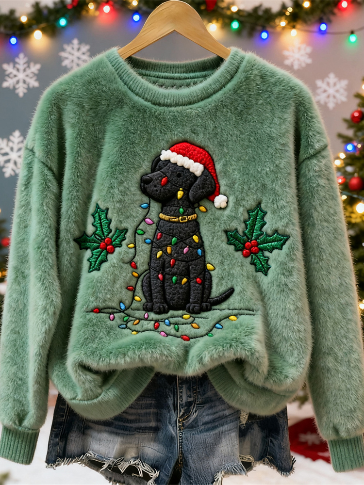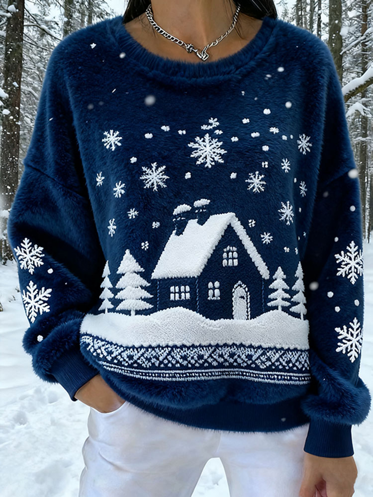 Lady Christmas Winter Warmth Round Neck Flannel Sweatshirt