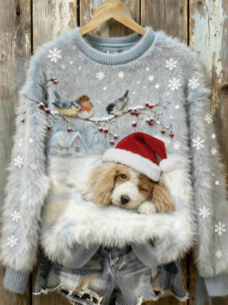 Vintage Christmas Two Robins And Lazy Puppy Art Women's Cozy Plush Sweater