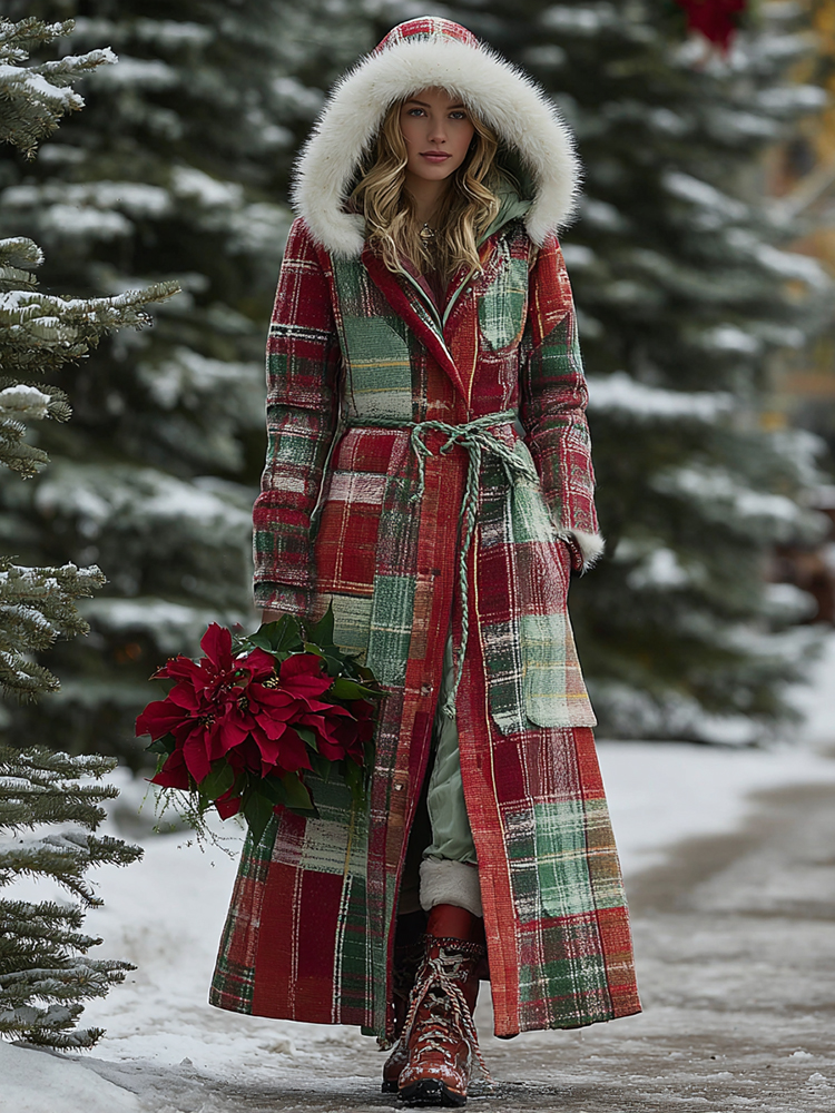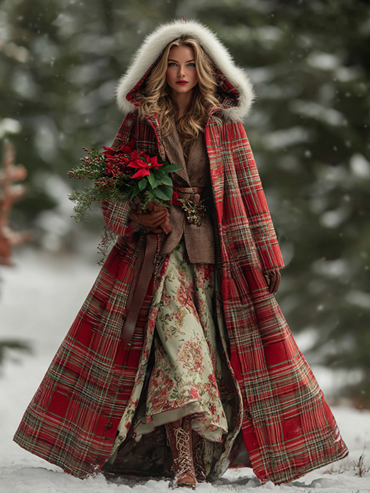 Women's Christmas Scottish Classic Plaid Knit Hood With Fur Collar Coat