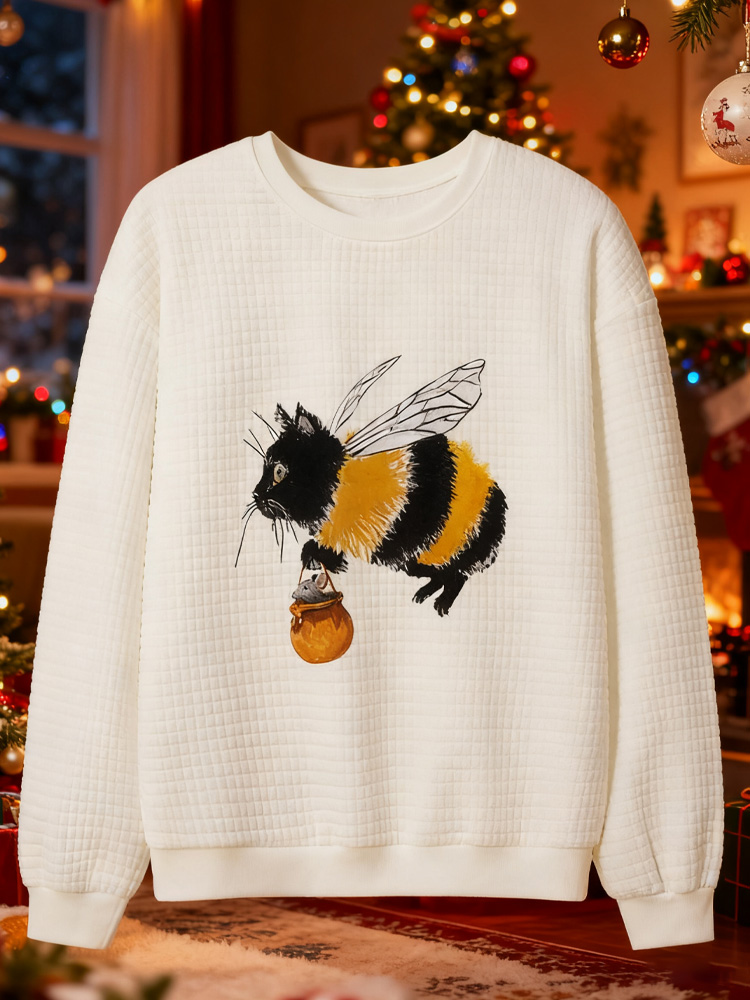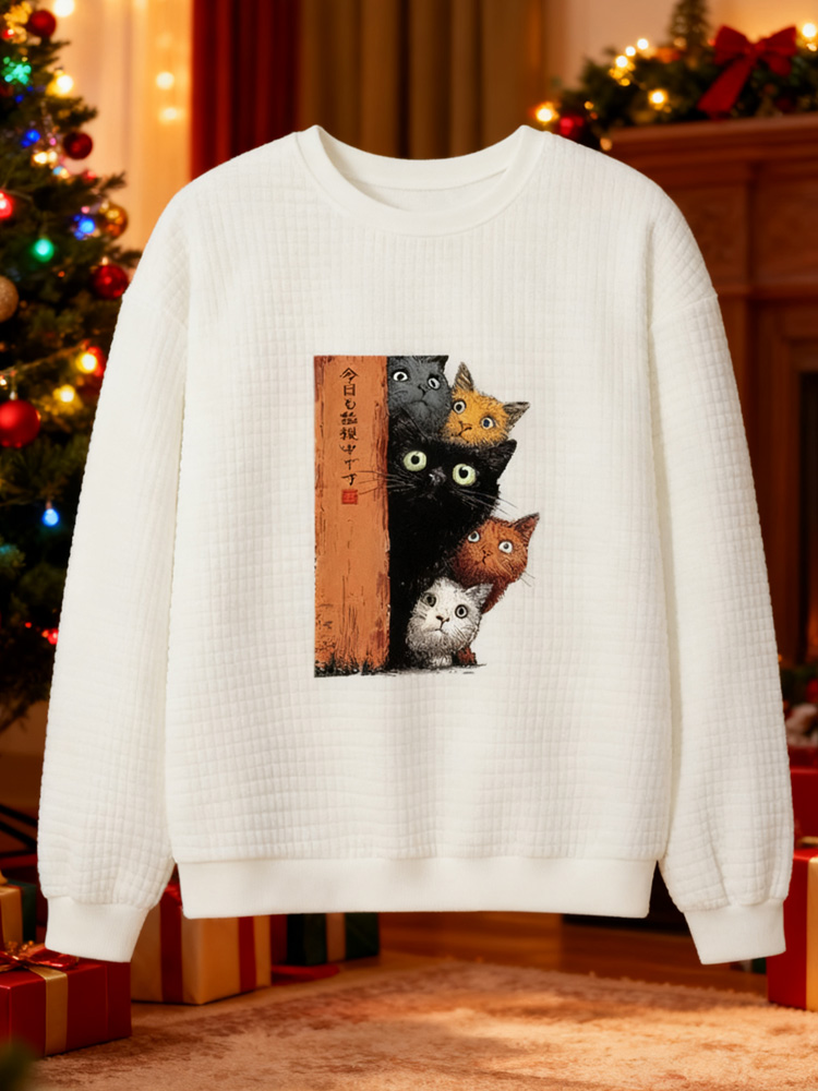 Japanese Art Funny Black Cat Print Waffle Sweatshirt