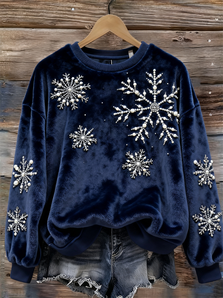 Christmas Classy Snowflakes Beaded Cozy Plush Sweatshirt