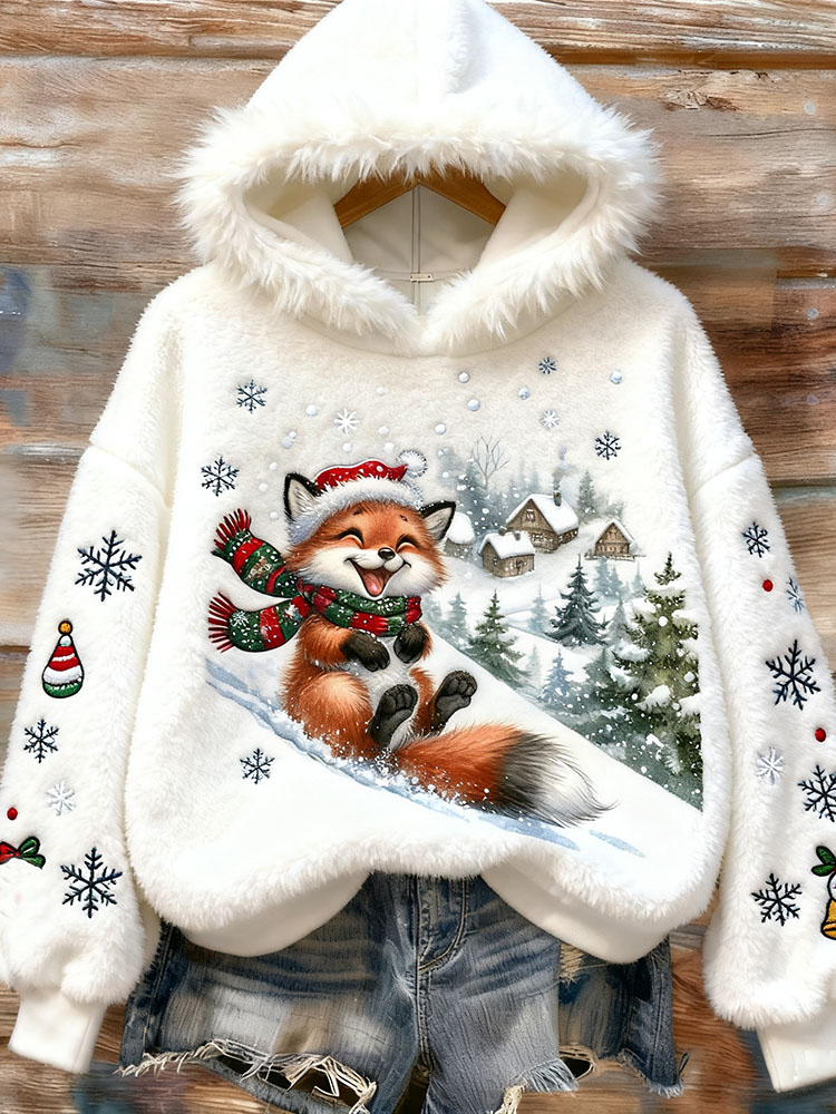 Vintage Christmas Happy Fox Art Women's Cozy Plush Sweater Hoodie