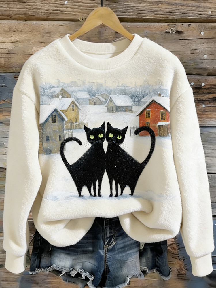 Women's Cute Cat And Snow Scene Pattern Winter Plush Crew Neck Sweatshirt