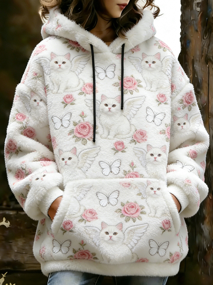 Cute Winged Cat And Flower Pattern Comfortable Plush Winter Hoodie For Women
