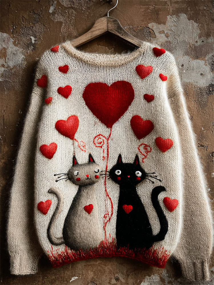 Valentine's Day Heart-shaped Cat Pattern Women's Sweater