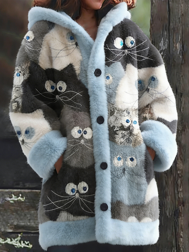 Cute Cat Face Art Pattern Plush Button-up Hooded Sweatshirt
