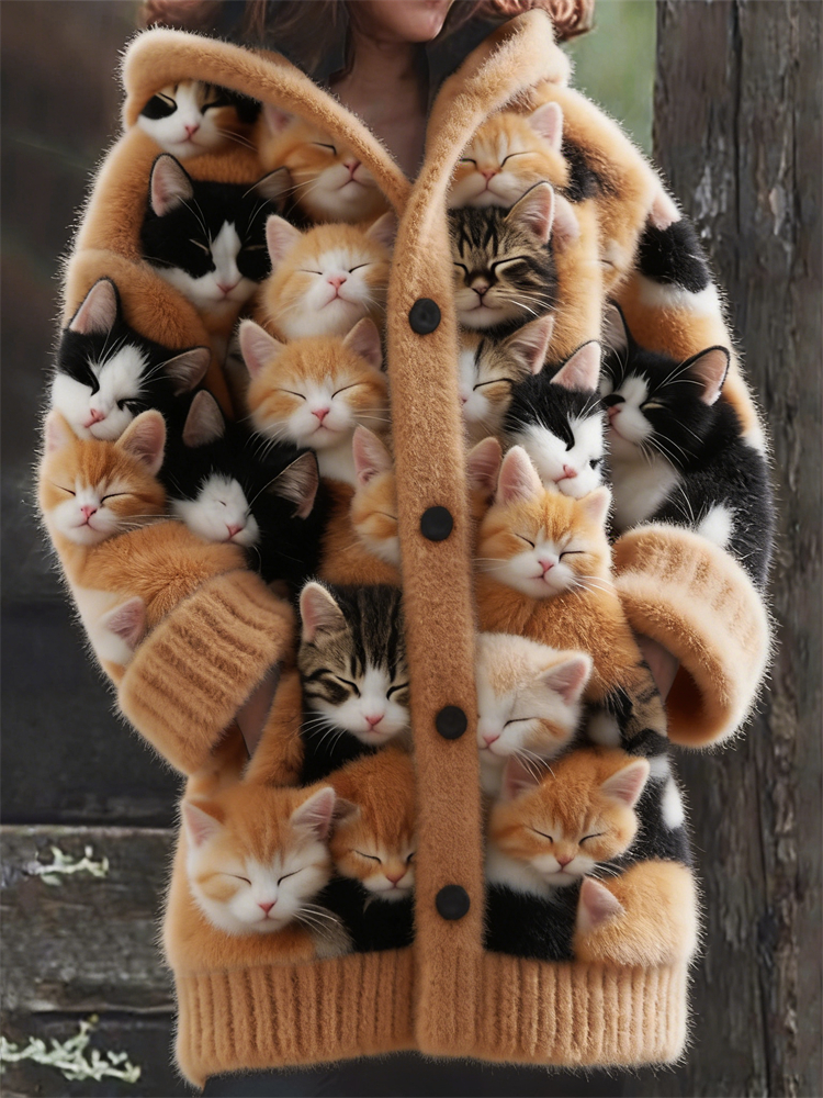 Crowded Sleeping Fuzzy Cats Cozy Hooded Cardigan
