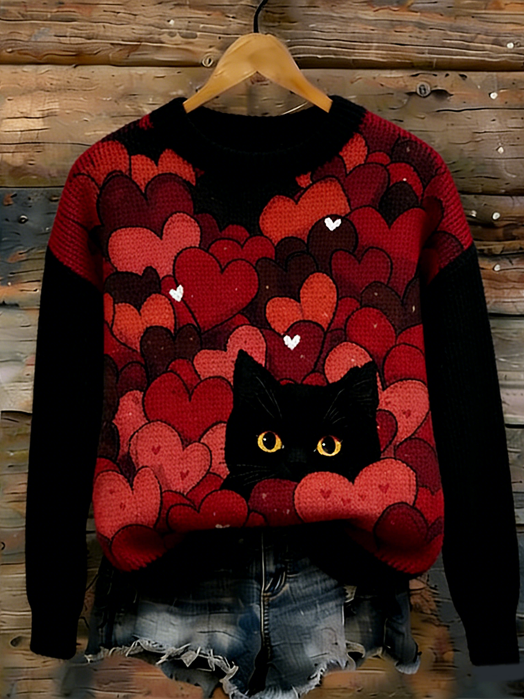 Valentine's Day Fun Cat Pattern Women's Round Neck Knit Sweater