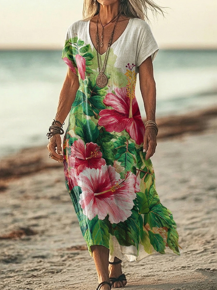 Women's Vintage Hibiscus-patterned Casual Linen Dress