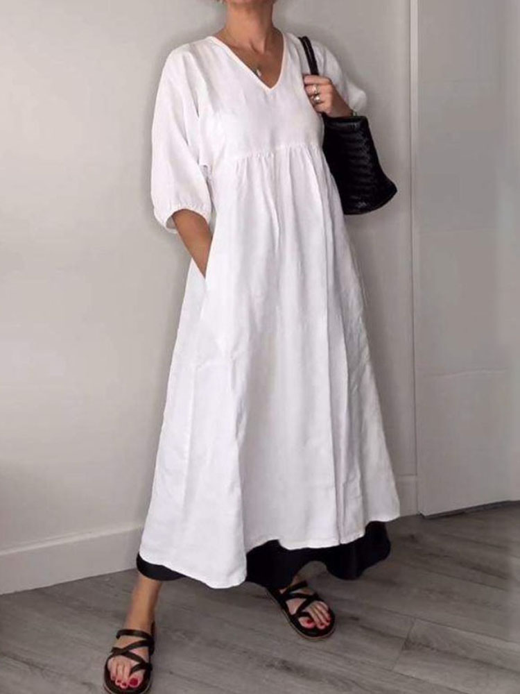 Women's Solid Color V-neck Linen Blend Short Sleeve Dress
