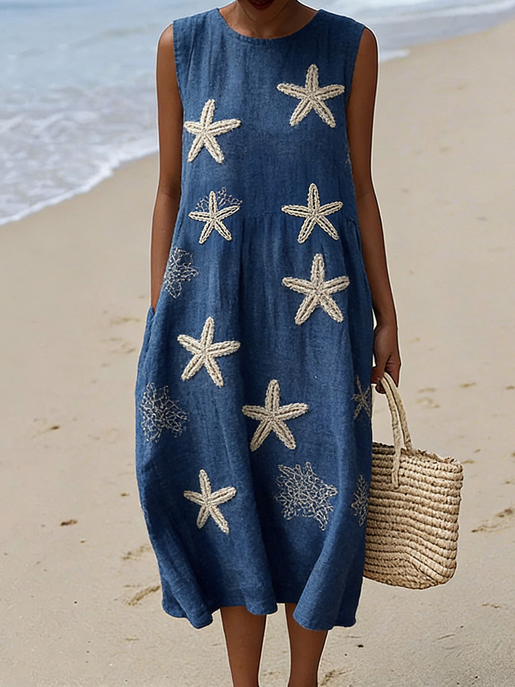 Vintage Starfish Pattern Flowy Linen Midi Dress