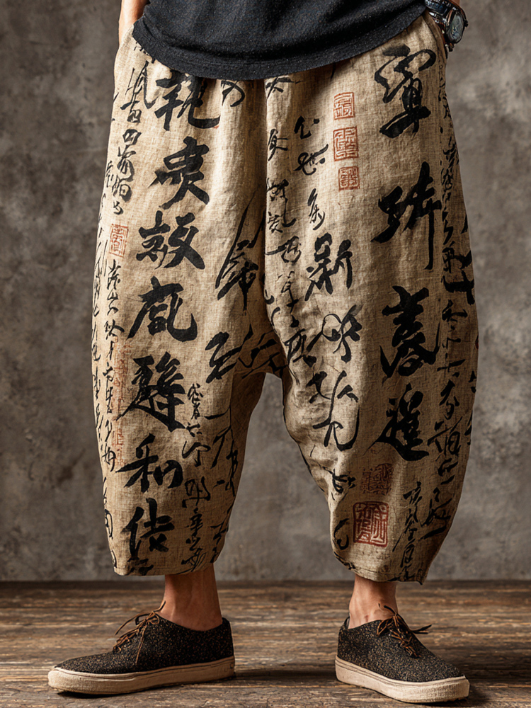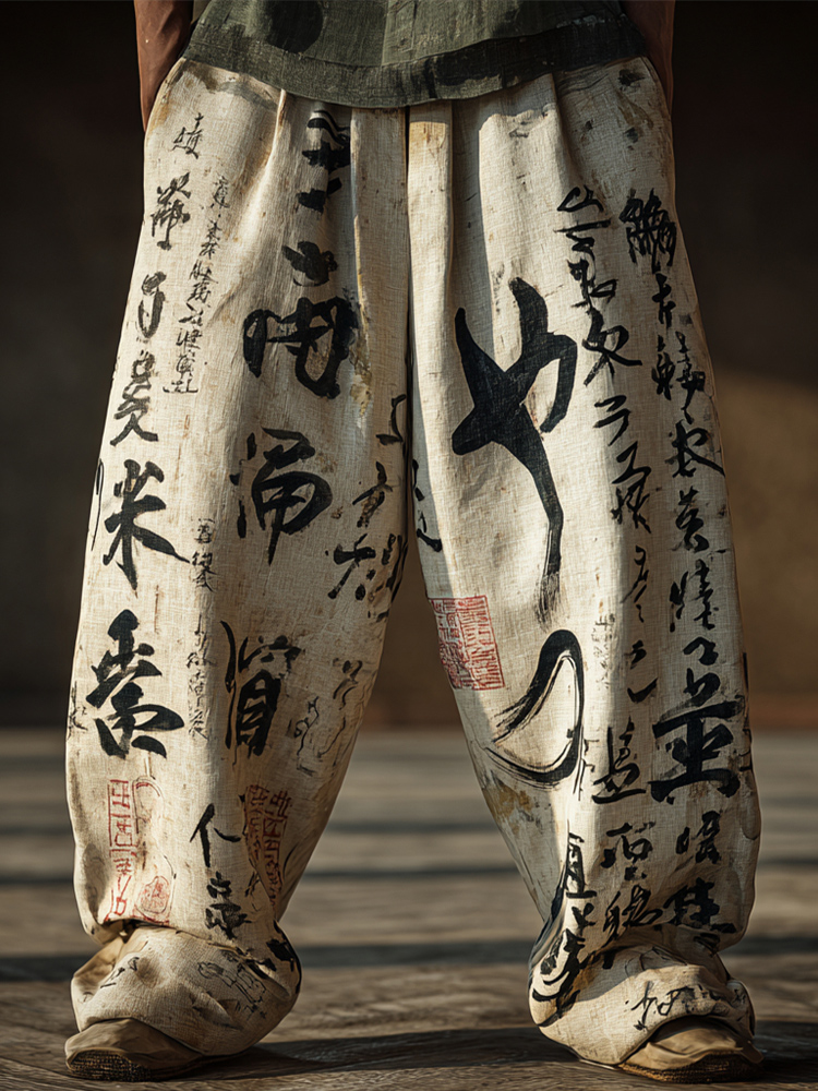 Japanese Zen Calligraphy Men's Linen Long Sleeve Shirt
