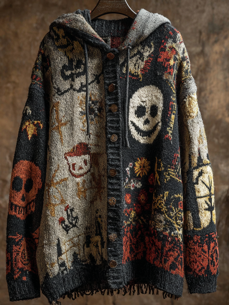Halloween Skeleton And Ghost Face Element Women's Hooded Knit Sweater Jacket