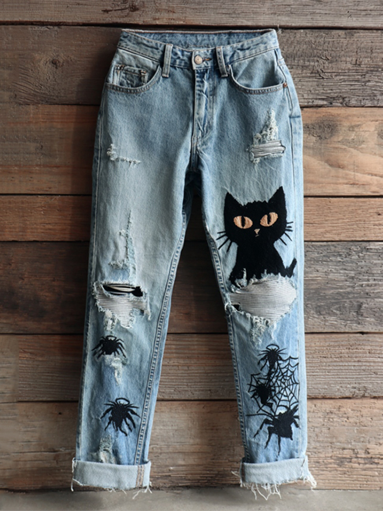 Women's Halloween Black Cats And Spiders Embroidery Vintage Washed Jeans