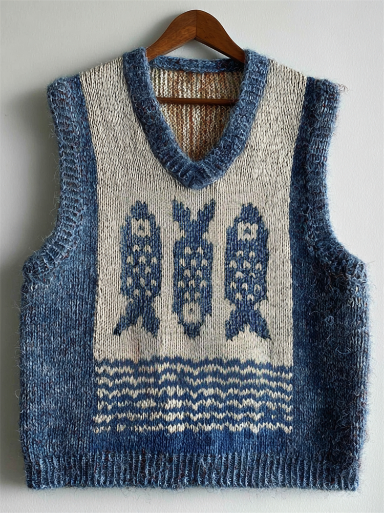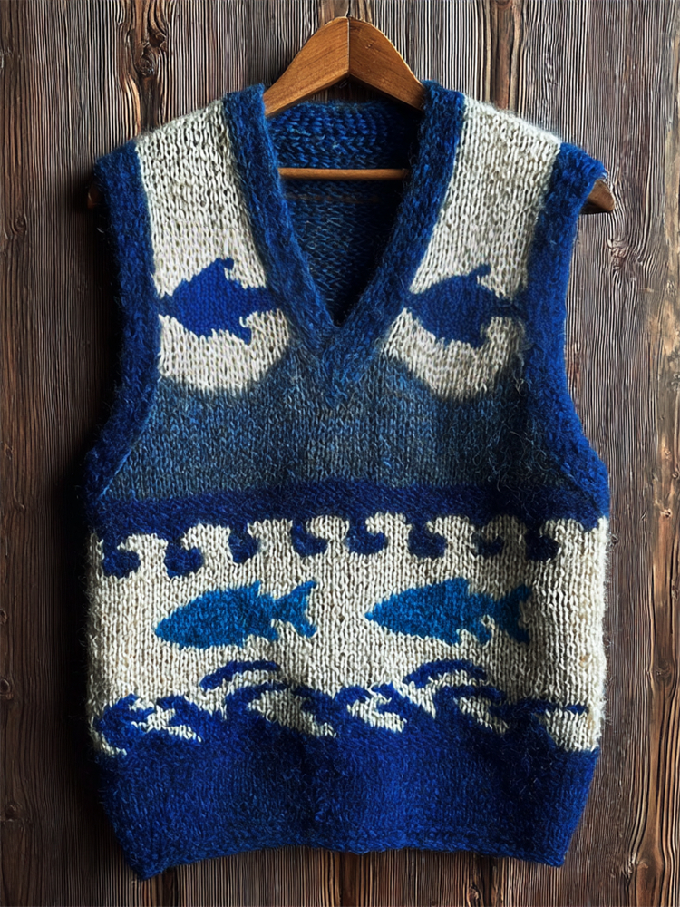 Vintage Fish & Sea Waves Colorblock Cozy Knit Isle Vest