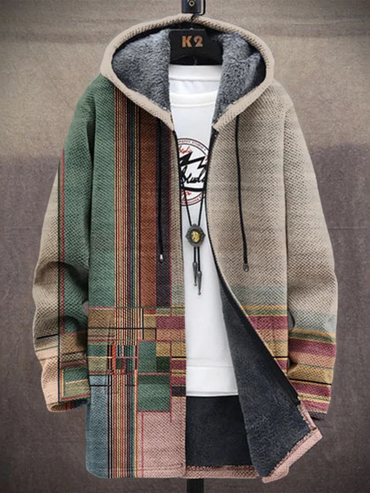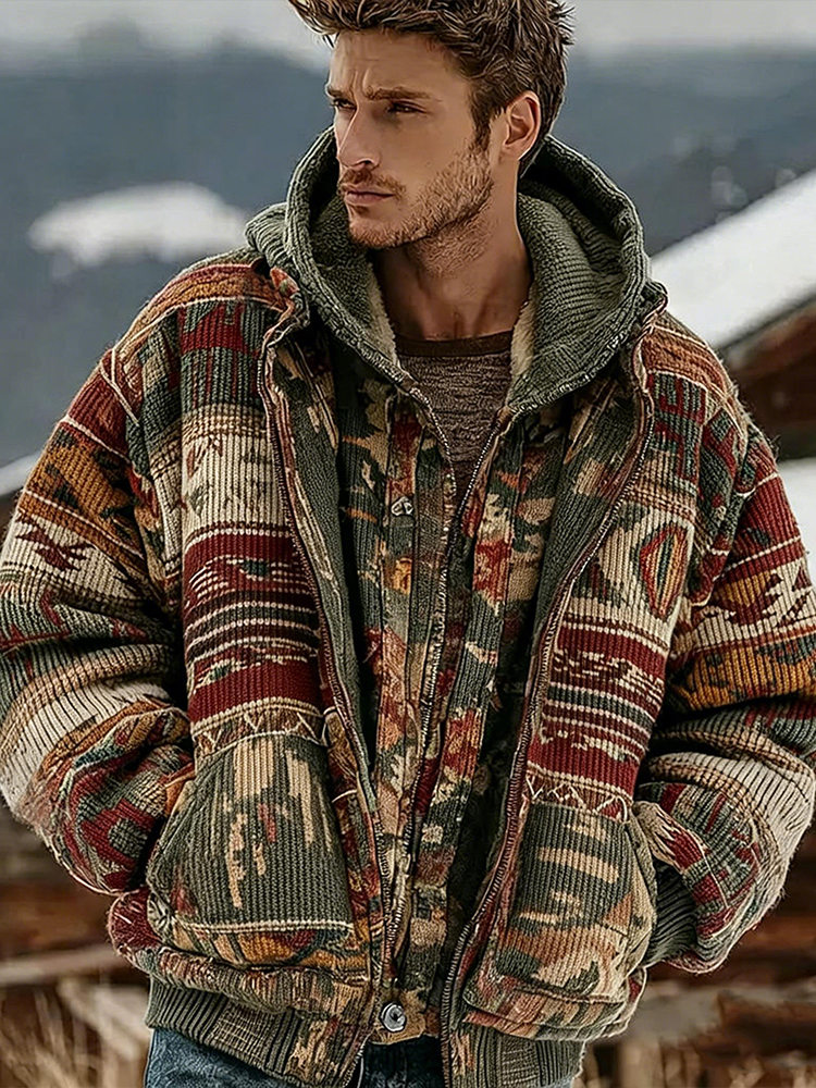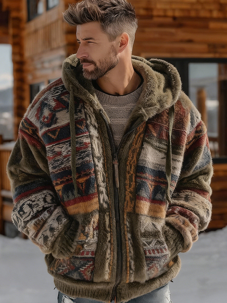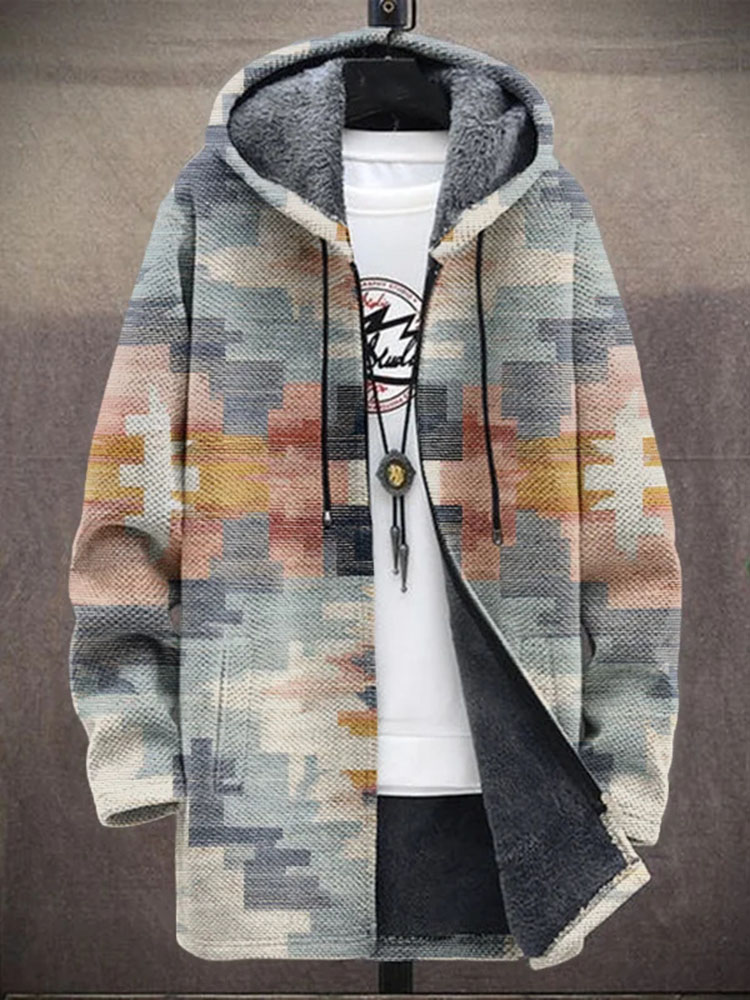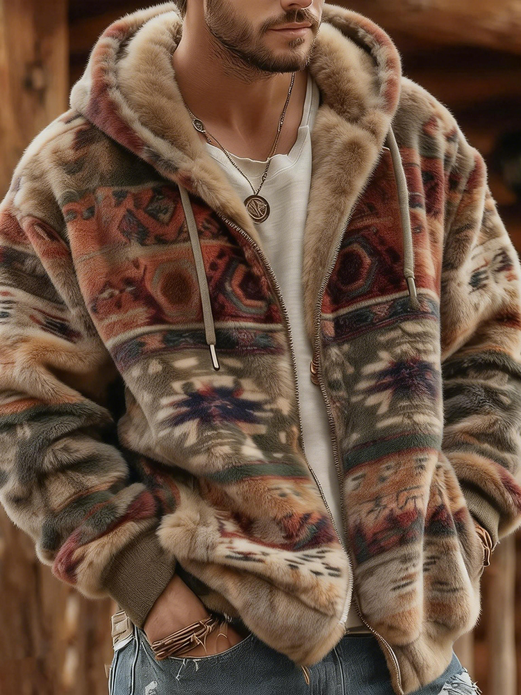 Men's Vintage Tribal Geometric Plush Warm Zip-up Hooded Sweatshirt