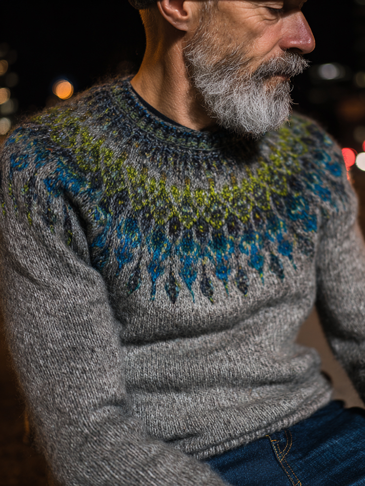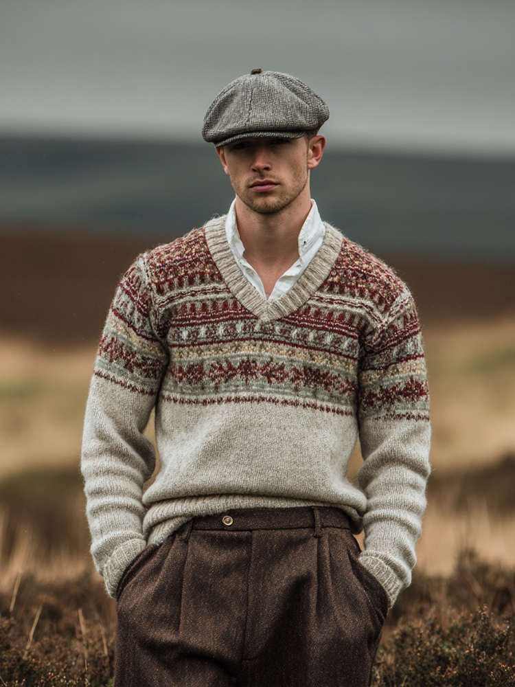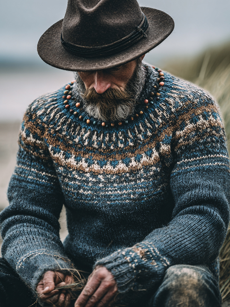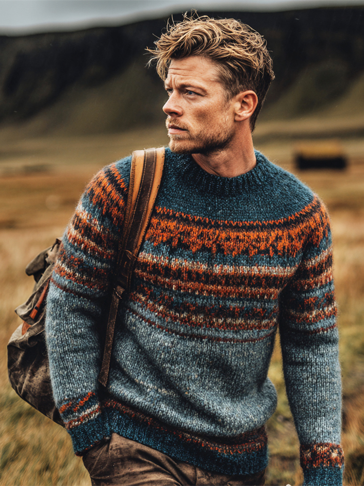 Men's Vintage 70s Retro Yoke Cozy Fair Isle Sweater
