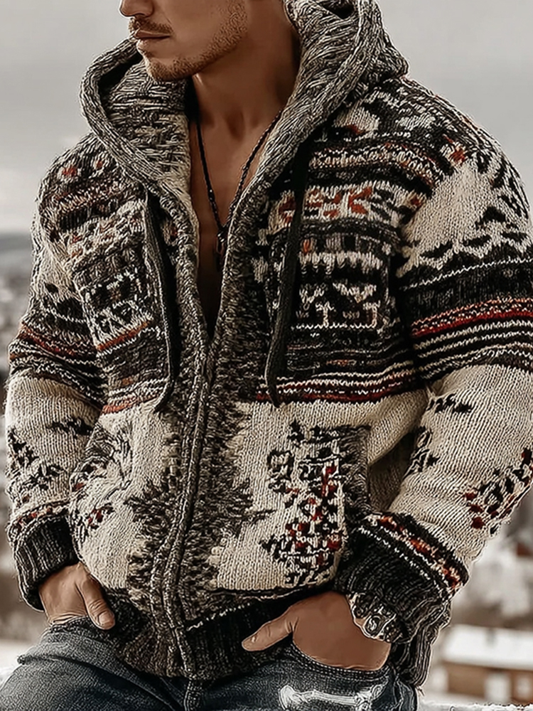 Men's Retro Tribal Geometric Knitted Jacquard Zip-up Hooded Sweater