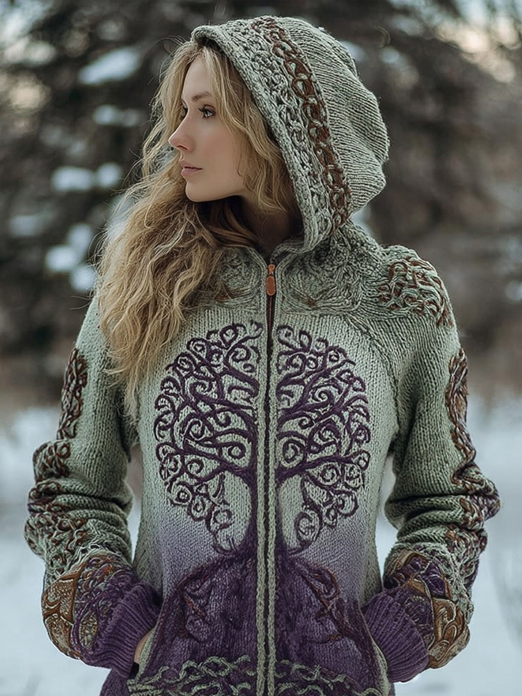 Viking Tree Of Life Embroidered Gradient Zip Up Hooded Cardigan