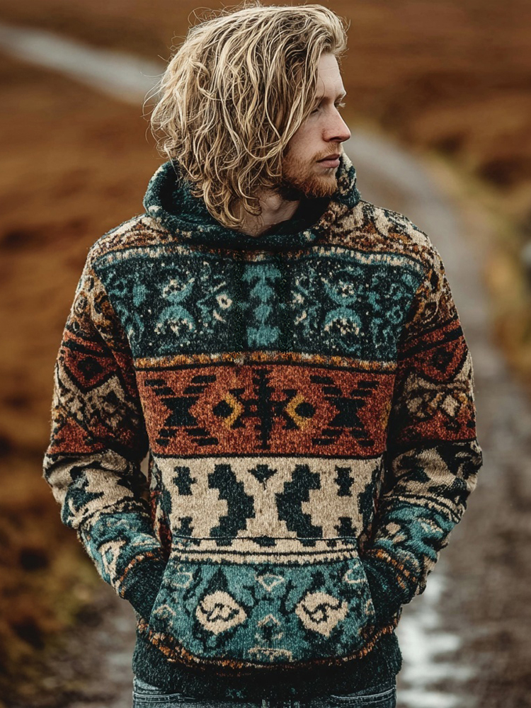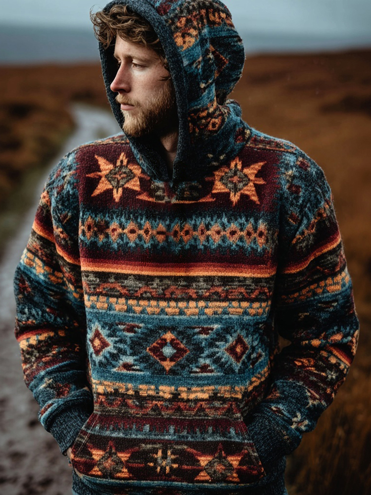 Men's Retro Western Aztec Pattern Cozy Knit Hooded Sweater