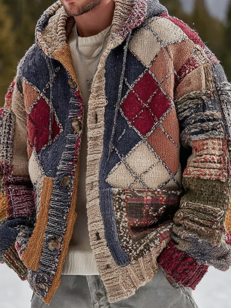 Men's Geometric Colorblock Knitted Warm Hooded Knit Sweater Jacket