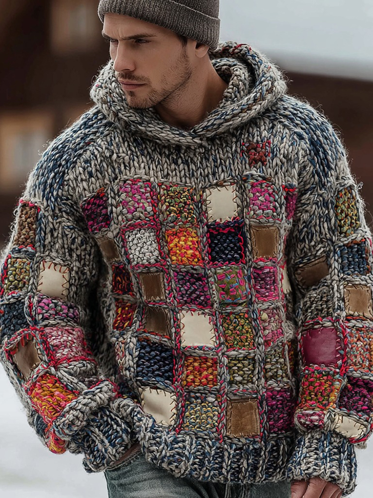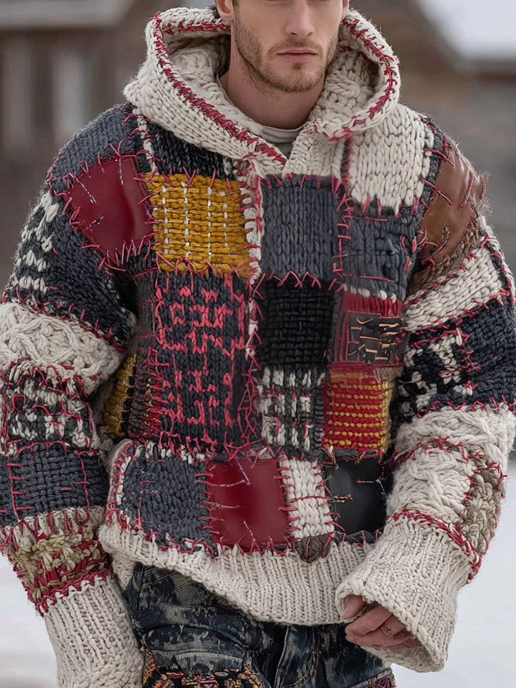 Men's Fair Isle Irregular Patch Knit Warm Hooded Sweater