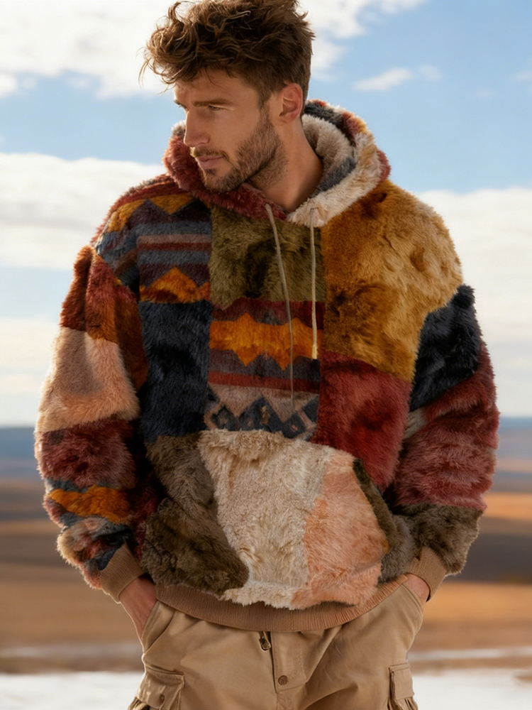 Men's Retro Geometric Color-blocked Plush Hoodie