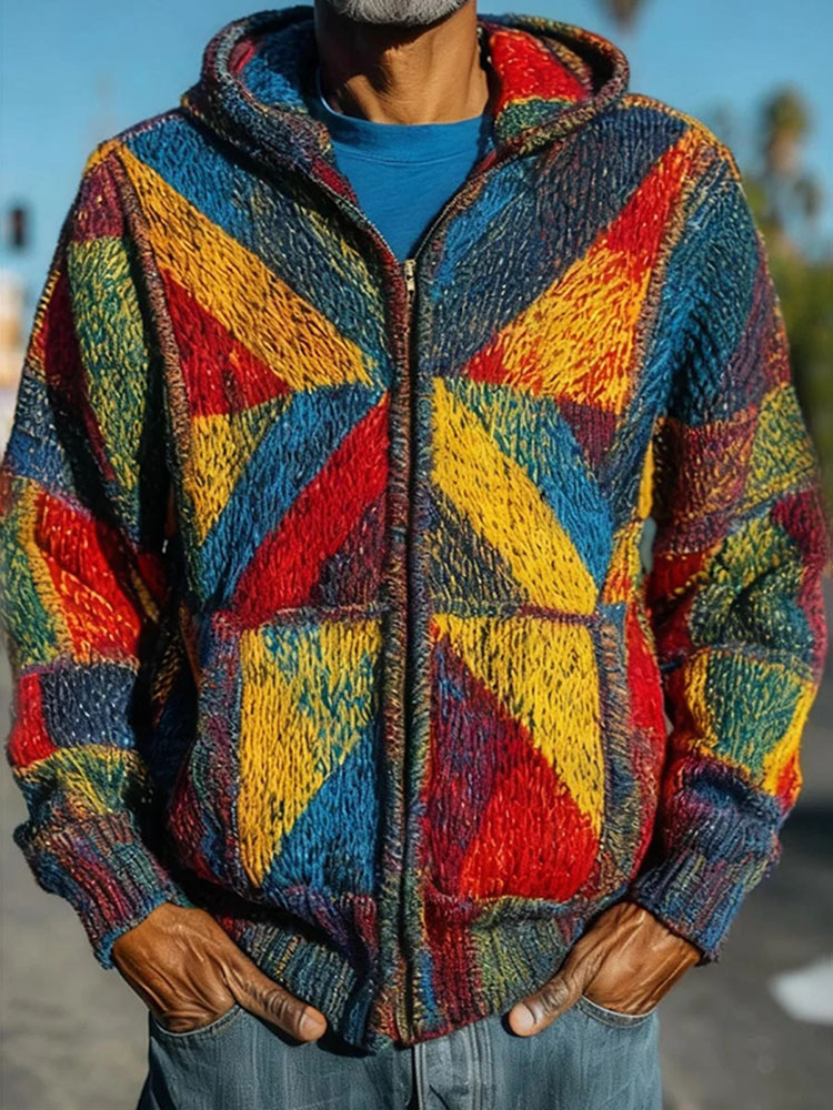 Men's Colorful Geometric Colorblock Knitted Warm Zipper Hooded Sweater