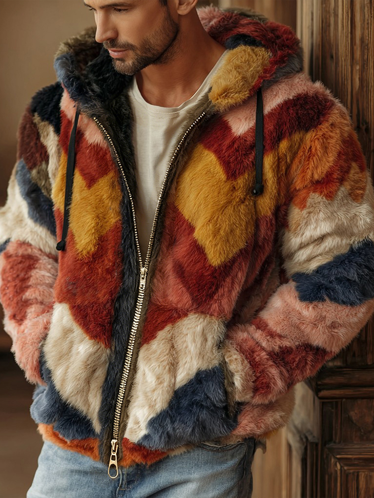 Men's Retro Geometric Color Plush Zip-up Jacket