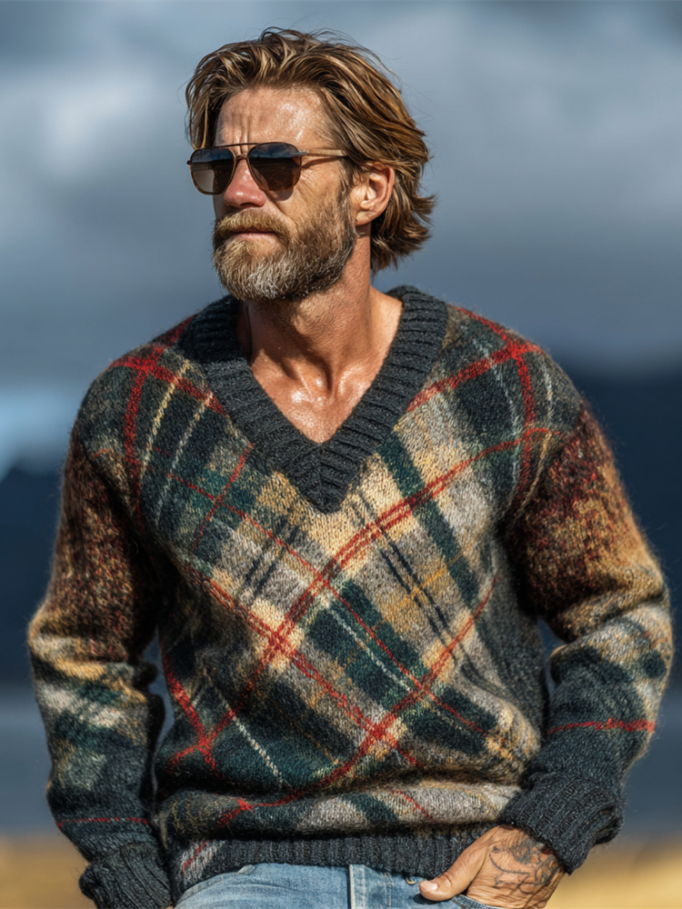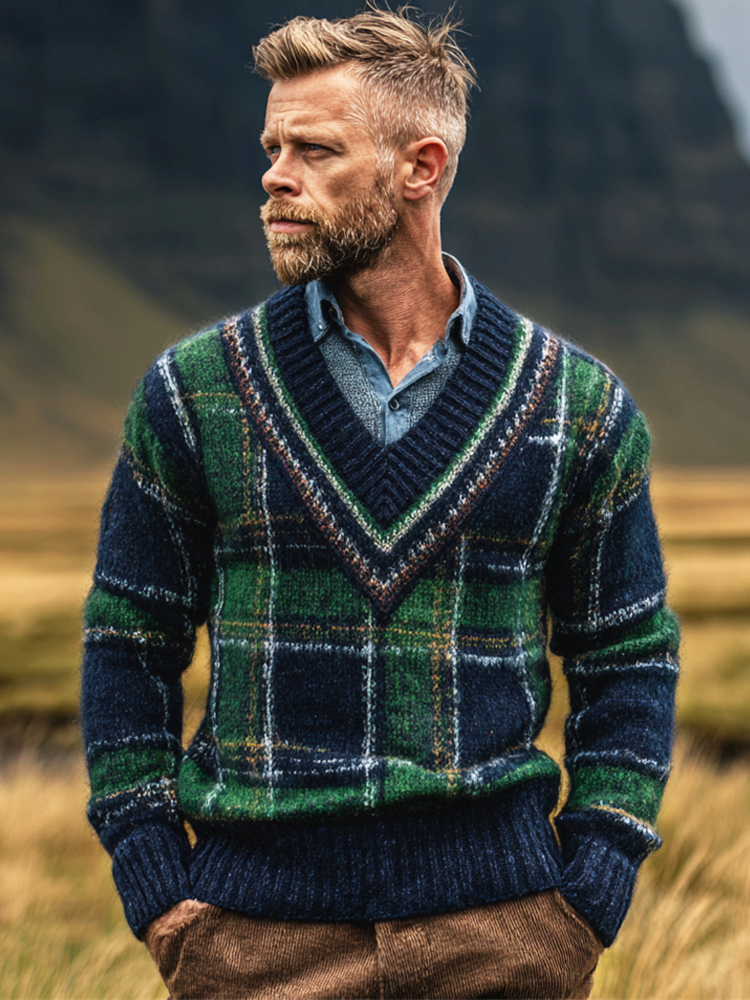British Vintage Plaid Men's V-neck Icelandic Sweater