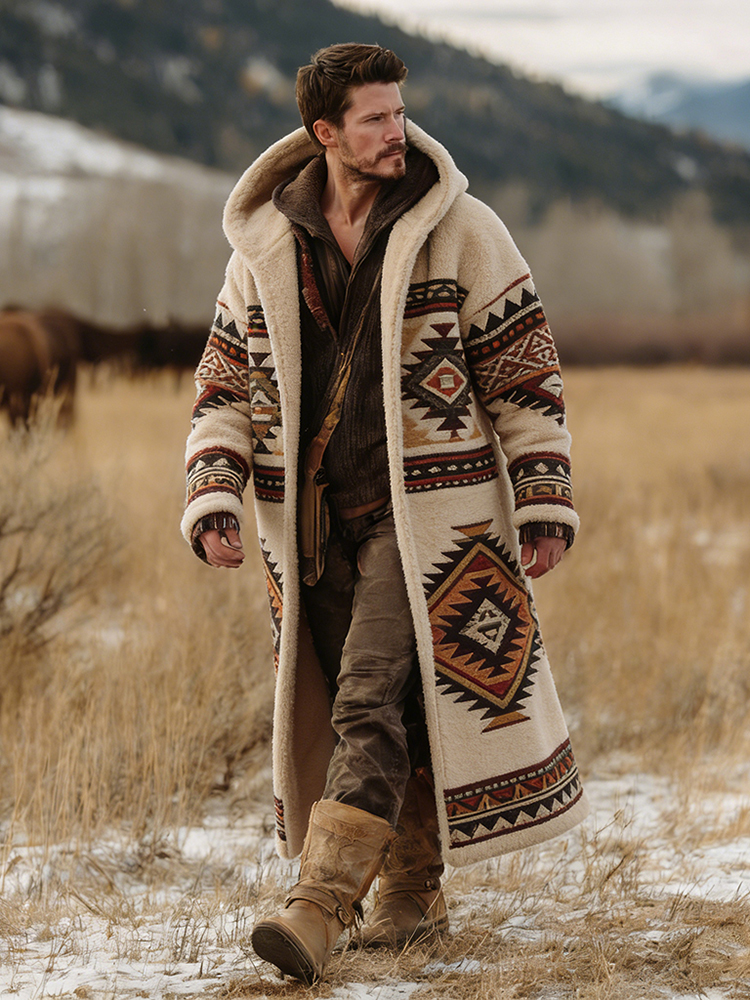 Men's Vintage Tribal Aztec Pattern Plush Long Coat