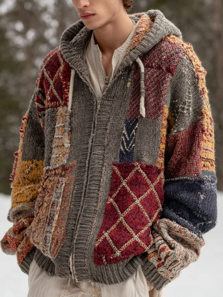 Men's Tribal Geometric Patchwork Knitted Warm Zip-up Hooded Sweater