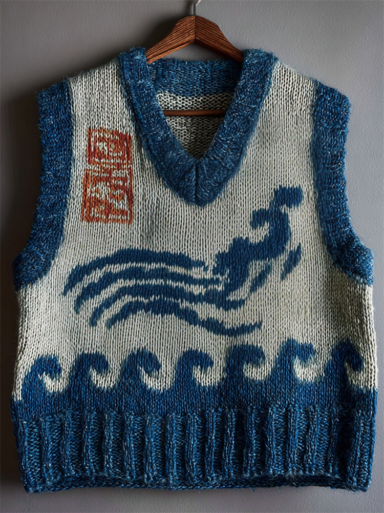 Japanese Sea Waves Lino Art Contrast Cozy Knit Vest