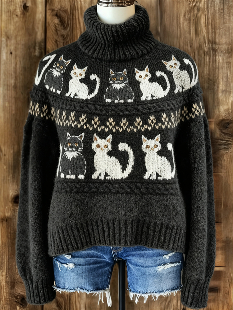 Vintage Black & White Cats Yoke Turtleneck Isle Sweater