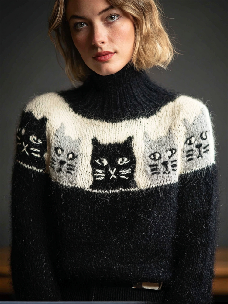 Vintage Black & White Cats Yoke Turtleneck Sweater