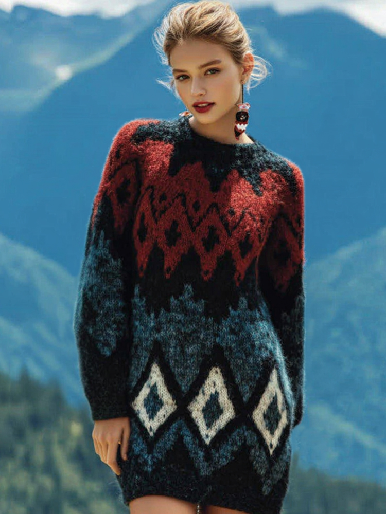 Women's Norwegian Icelandic Jacquard Cozy Knit Round Neck Dress